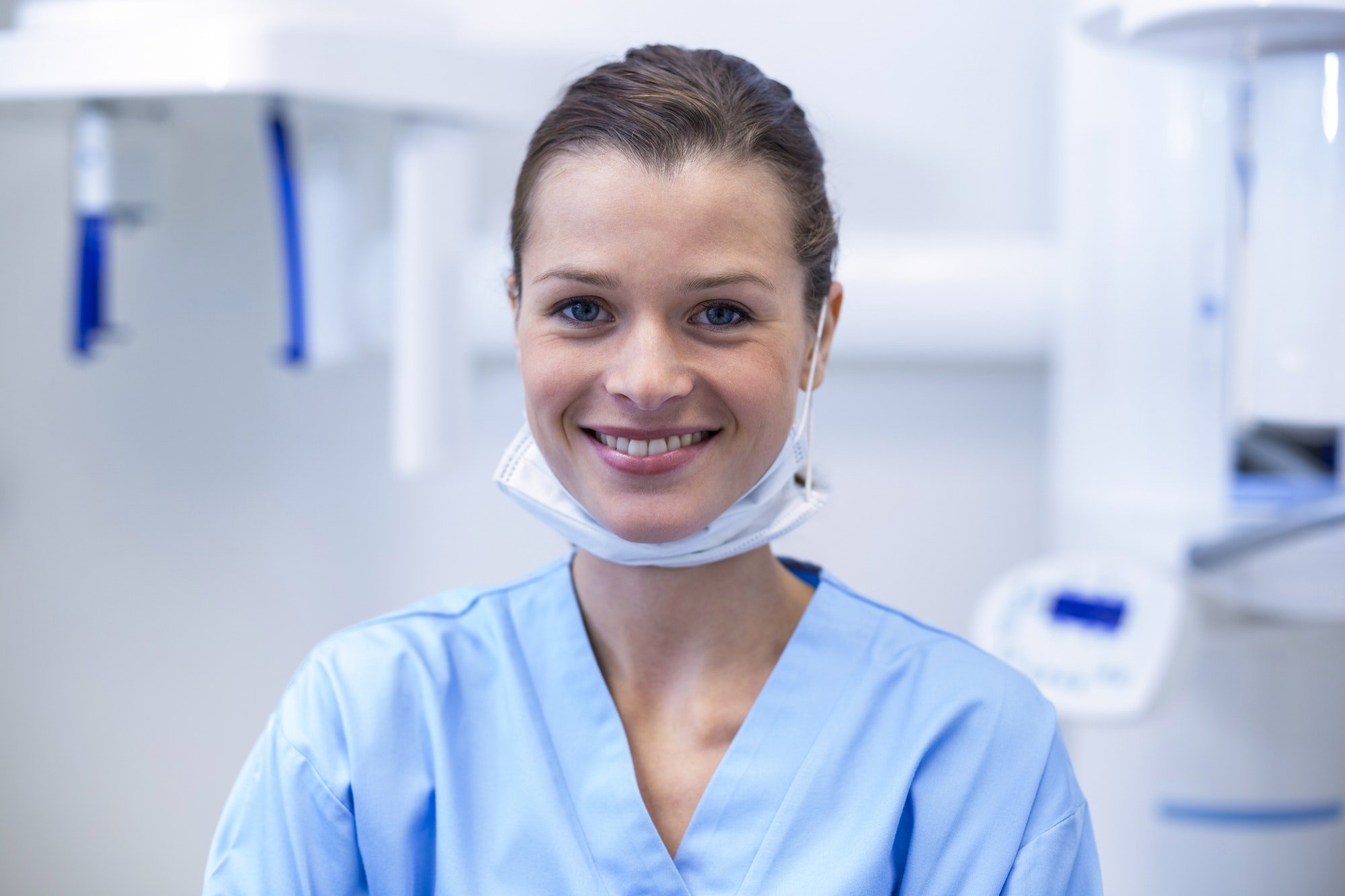 portrait of female doctor wearing scrubs standing in hospital corridor holding clipboard.jpg